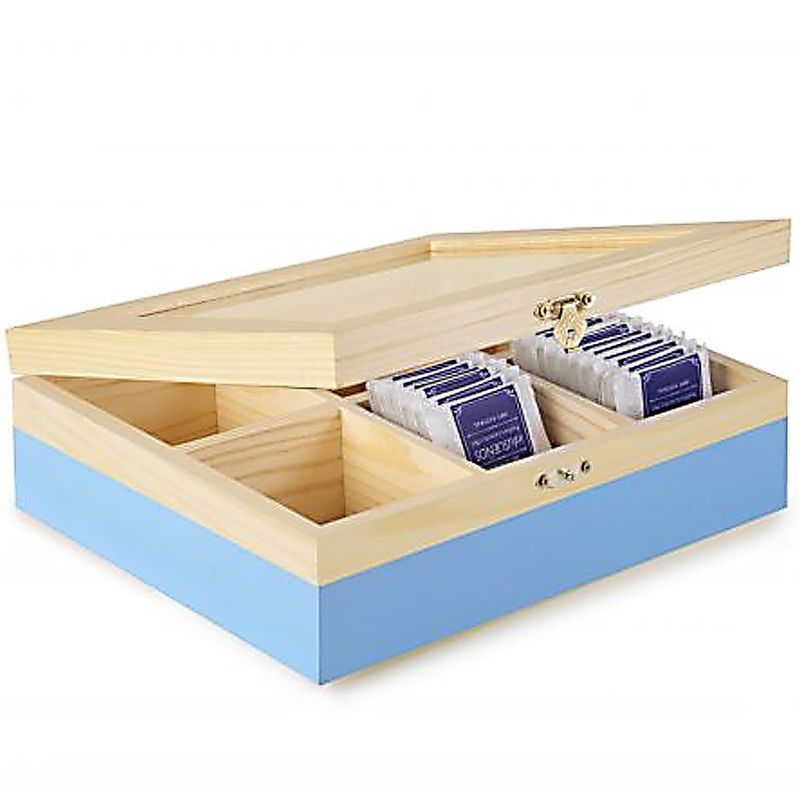 Esta caixa de chá azul pode conter até 6 tipos de chá, ervas ou especiarias. Seu design prático mantém tudo organizado e ao alcance das mãos. Os 6 compartimentos são flexíveis e se adaptam ao tamanho e formato dos sachês de chá. Ideal para quem gosta de saborear uma variedade de chás.
